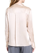 Button down shirt draped in semi-sheer silk charmeuse. The Joey is a classic fit with an inverted box pleat at the back and raw shirttail hem. Complete with an exposed placket, chest patch pocket, spread collar, and round cuffs.